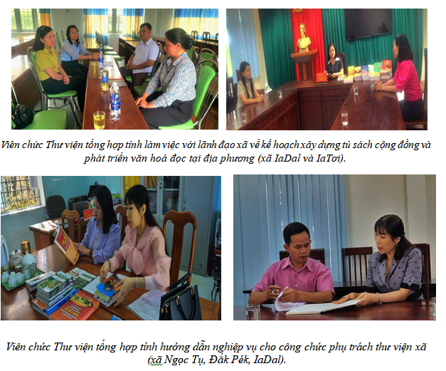 Song song với việc bổ sung những đầu sách để xây dựng tủ sách, viên chức Thư viện Tổng hợp tỉnh hướng dẫn chuyên môn nghiệp vụ cho các công chức văn hoá phụ trách tủ sách xã về cách thức xây dựng, bảo quản tài liệu, cách sắp xếp, tổ chức tài liệu cho khoa học, cách phục vụ bạn đọc và theo dõi số liệu phục vụ, cách phối hợp với các đơn vị liên quan để tổ chức các hoạt động phát triển văn hoá đọc nhằm hưởng ứng Ngày sách và Văn hoá đọc Việt Nam, hưởng ứng tuần lễ học tập suốt đời tại địa phương.