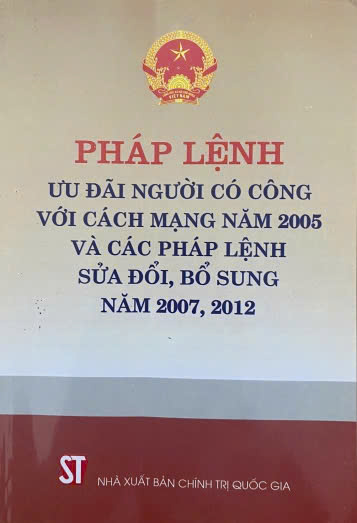 – “Pháp lệnh ưu đãi người có công với cách mạng năm 2005 và các pháp lệnh sửa đổi, bổ sung năm 2007, 2012”, Nhà xuất bản Chính trị Quốc gia ấn hành năm 2012. Pháp lệnh ưu đãi người có công với cách mạng (Pháp lệnh số 26/2005/PL-UBTVQH11), ban hành ngày 29/6/2005, quy định đối tượng, phạm vi, chính sách ưu đãi với người có công và thân nhân. Các chế độ như trợ cấp, phụ cấp, bảo hiểm y tế, hỗ trợ nhà ở, giáo dục, chăm sóc sức khỏe được cụ thể hóa. Pháp lệnh số 35/2007/PL-UBTVQH11, sửa đổi, bổ sung Điều 9 và 10 năm 2007, mở rộng đối tượng hưởng ưu đãi, thay đổi mức trợ cấp, điều kiện xét duyệt. Pháp lệnh số 04/2012/UBTVQH13, ban hành 16/7/2012 (hiệu lực từ 1/9/2012), sửa đổi thêm Điều 2, bổ sung chính sách hỗ trợ đối với người nhiễm chất độc hóa học,… Cuốn sách giúp cán bộ thực thi chính sách, làm cơ sở áp dụng pháp luật; giúp Luật sư, chuyên gia, sinh viên ngành luật, chính sách xã hội có nội dung tham khảo toàn diện. Đối với người có công và thân nhân hiểu rõ quyền lợi trợ cấp và những ưu tiên,…