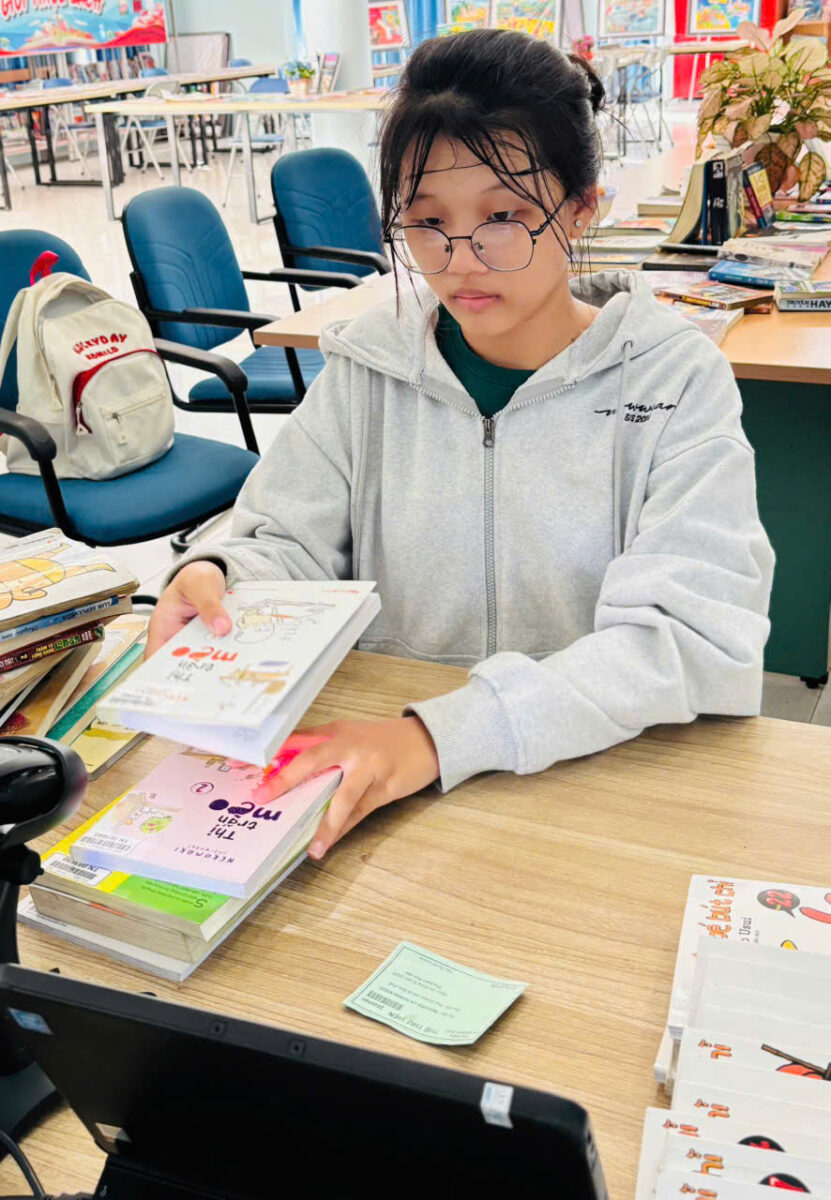 Các em học sinh thực hiện thao tác quét thẻ, quét mã sách để mượn tài liệu
